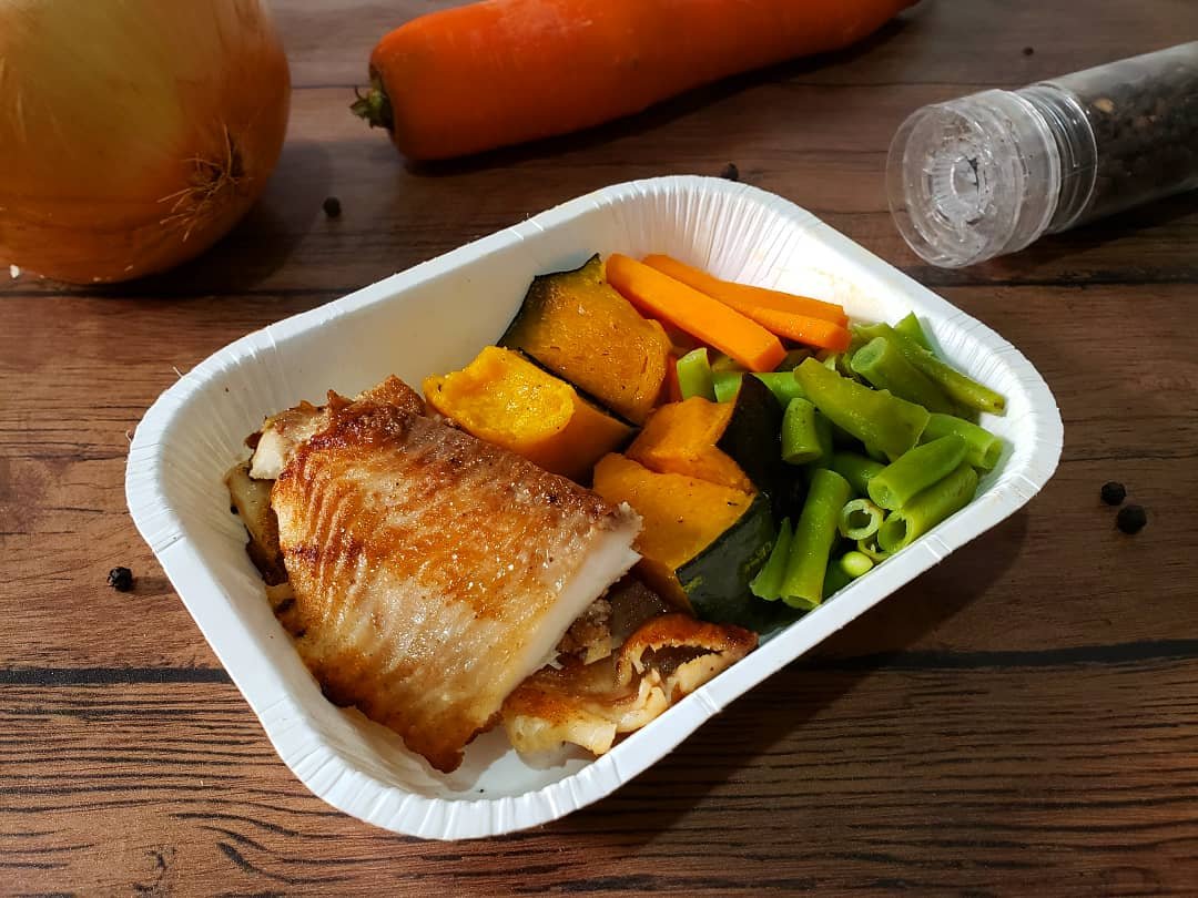 1 un. Filé de tilápia grelhada 100g + Abóbora cabotiã assada 100g + Mix(vagem e cenoura) 100g – Peso liq. 300g