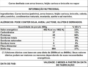 5 un. Carne desfiada com arroz branco, feijão carioca e brócolis no vapor 400g/cada