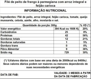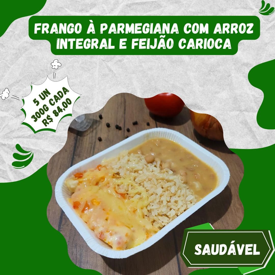 5 un. Filé de peito de frango à parmegiana com arroz integral e feijão carioca 300g/cada