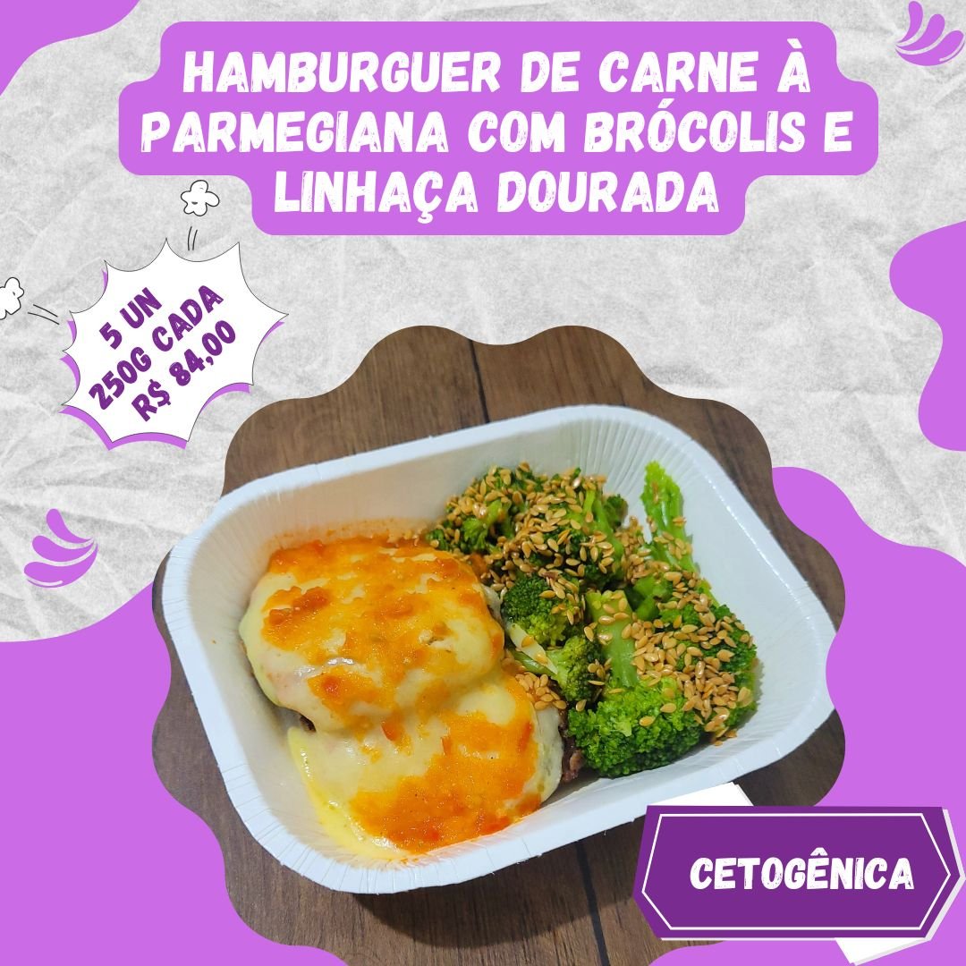 5 un. Hambúrguer de carne à parmegiana com brócolis no vapor e linhaça dourada 250g/cada