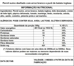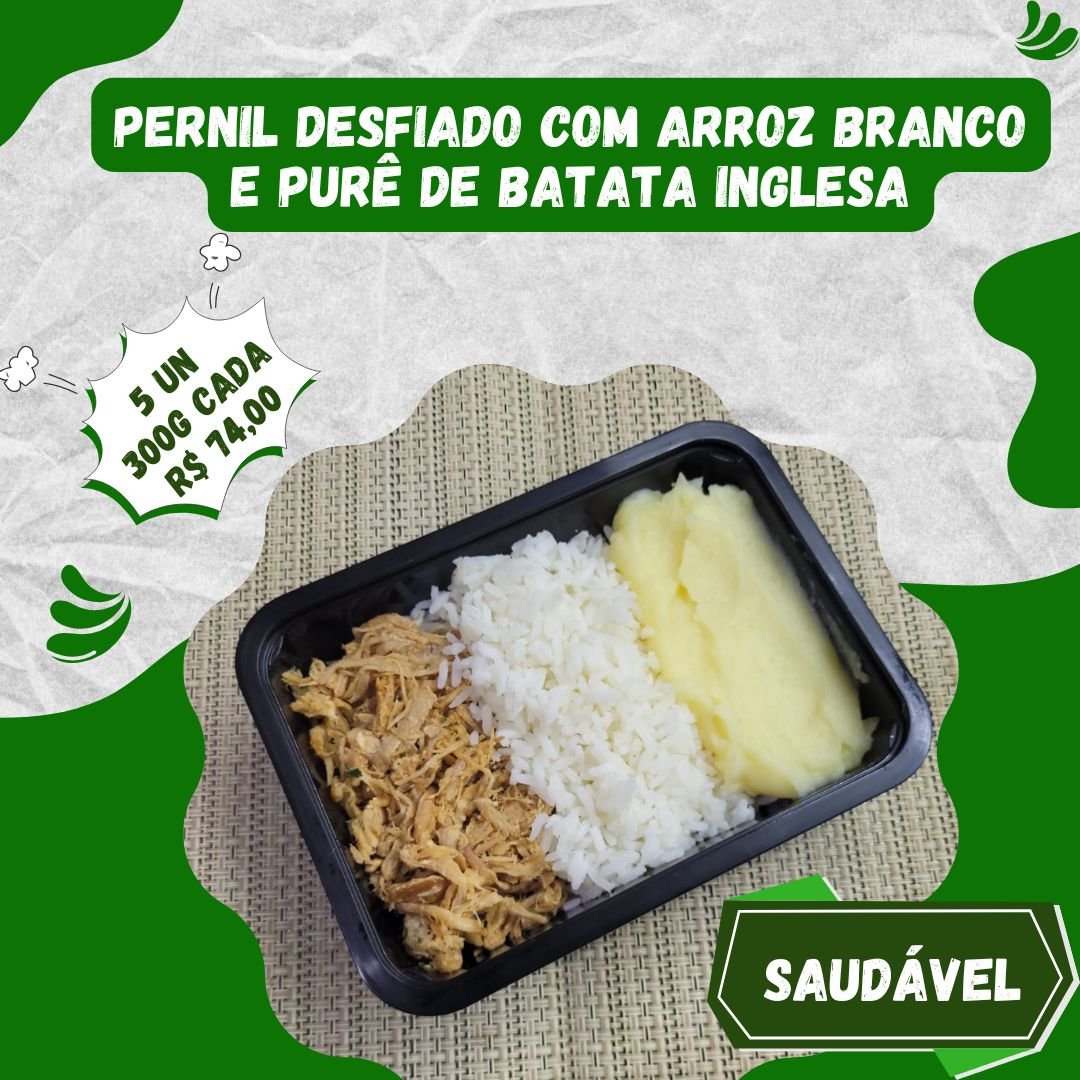 5 un. Pernil suíno desfiado com arroz branco e purê de batata inglesa 300g/cada