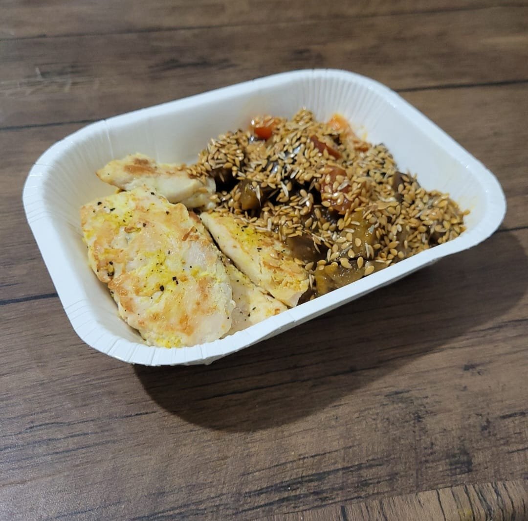 1 un. Filé de frango lemon pepper com berinjela refogada e linhaça dourada 250g