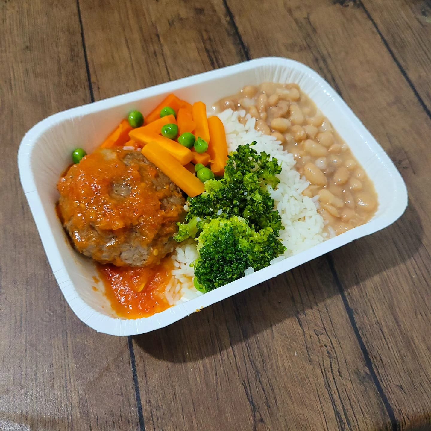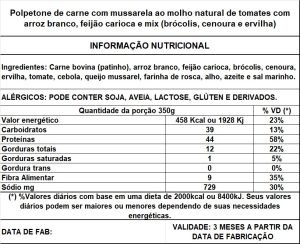 1 un. Polpetone recheado com mussarela 150g + Arroz branco 120g + Feijão carioca 80g + Mix(brócolis, cenoura e ervilha) 50g – Peso liq: 350g