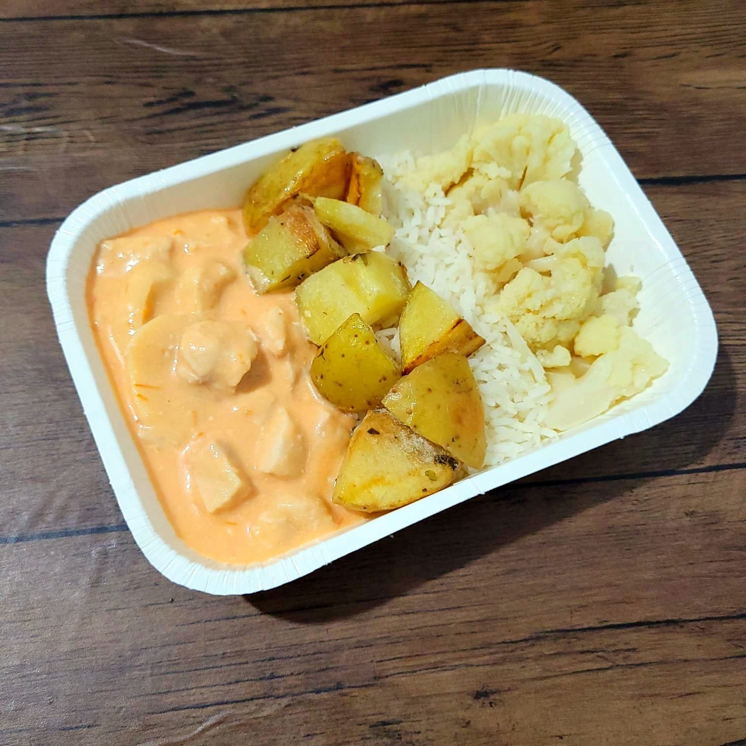 1 un. Strogonoff de frango 150g + Arroz branco 150g + Batata inglesa 50g + Couve-flor 50g – Peso liq. 400g